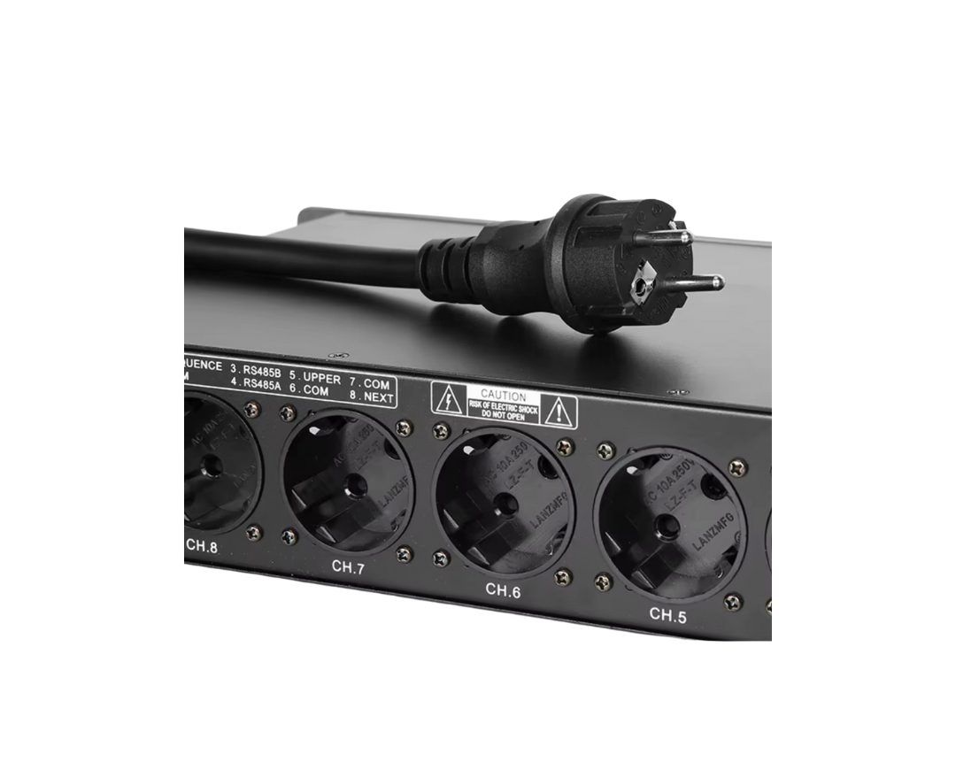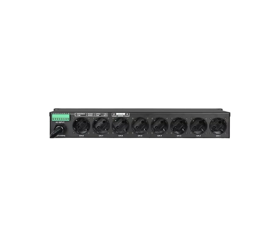 Brand Name : KONETModel : PS1016F Channel Number : 8 Outlets Loading per channel : 220v/30A ,6600w / channel Sequence Nme per step : 1 sec Port : USB Direct Output : 2 rear output Indicator : power per channel on Output connector : Universal connector Breaker : 63Amps /Air switch Power : 220v/50Hz , Ground Product Dimensions (HxDxW) : 44mm x 166mm x 482mm/438mm Dimensions : Weight : 2.85kg